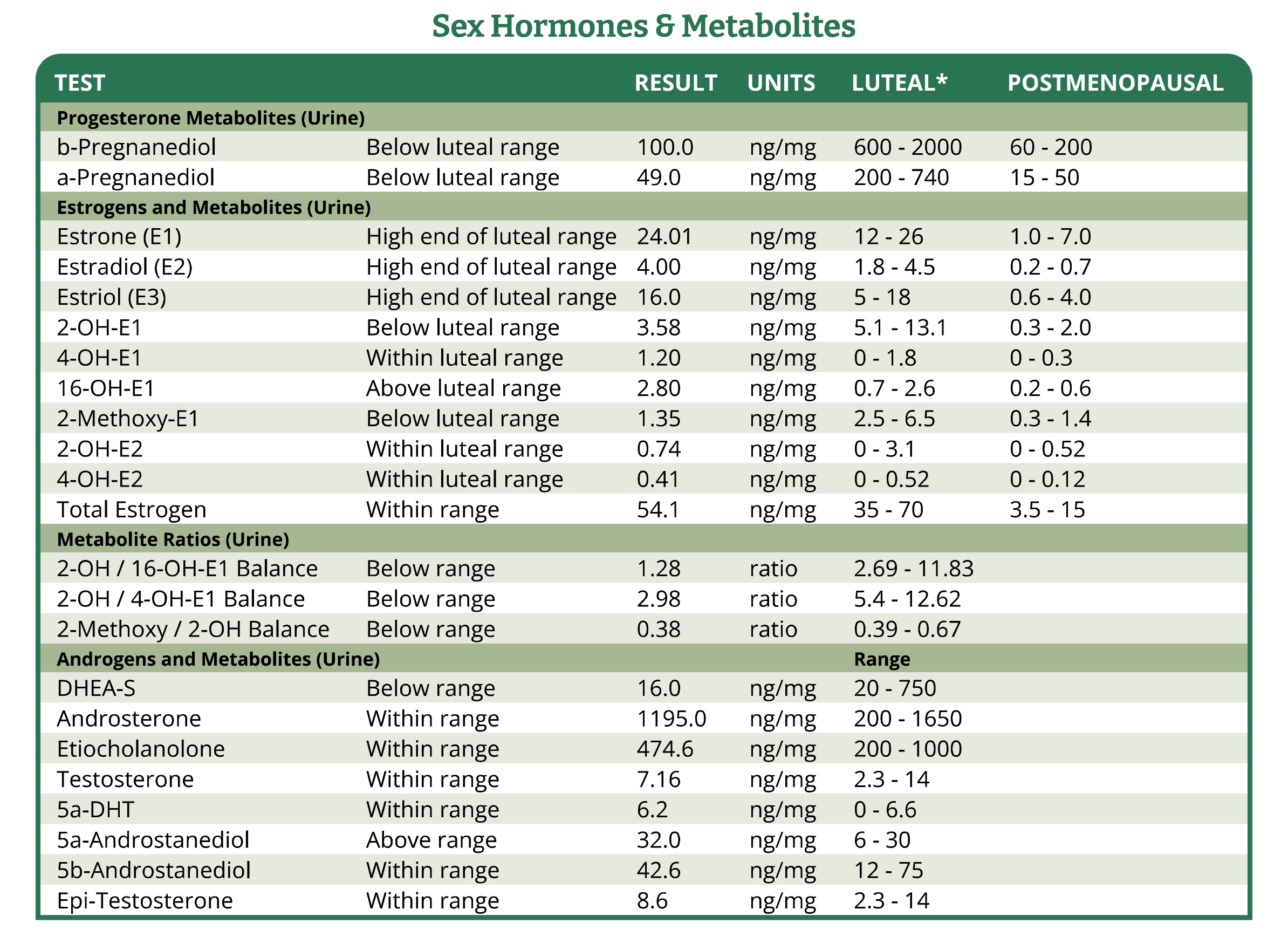 Progesterone is reflected in urine in the two urinary metabolites alpha and beta pregnanediol. The beta pathway is the major pathway. The minor alpha pathway reflects the production of alpha metabolites which contribute to progesterone's well-known impacts on mood.